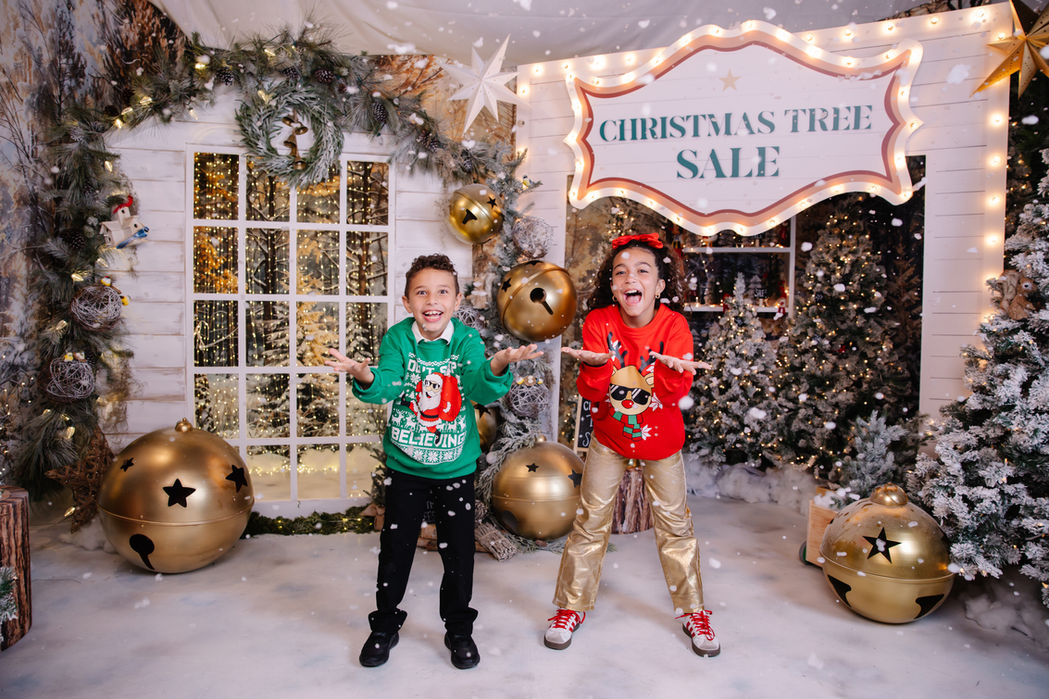 - Sesión privada de 2 horas con acceso exclusivo a los 3 decorados navideños (venta de árboles de Navidad, tienda de dulces navideños y arco minimalista).